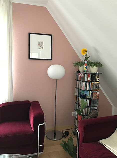 • Betont neu gestrichene Wand mit Passepartout in der Trendfarbe Rosa